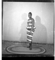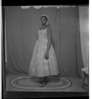 A woman wearing a dress, headscarf, and necklace standing in profile in the studio.