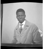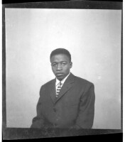 A man wearing a velvet jacket and tie sitting facing forward in the studio.