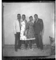 - Two girls wearing dresses and necklaces standing in profile between two men, one wearing a suit, tie and sunglasses facing forward in the studio.