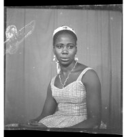 - A woman wearing a dress and headscarf sitting facing forward in the studio.