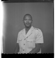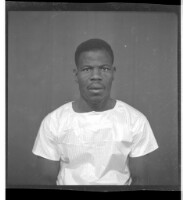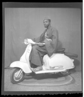 - A man wearing a boubou, hat, and with a radio set around his neck sitting in profile on a Vespa in the studio.