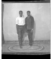 - Two men wearing dress shirts and pants standing facing forward in the studio.