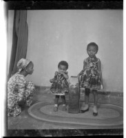 - Two little girls wearing dresses standing facing forward, a piece of metal is the in the middle of them and a woman is on their right.