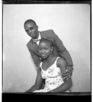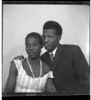 - A man wearing a jacket next to a girl wearing a dress, headscarf, and necklace, both sitting in profile in the studio.