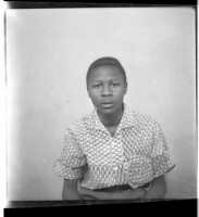 - A girl wearing a dress and headscarf facing forward in the studio.