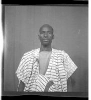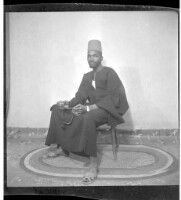 - A man wearing a boubou and hat holding a rosary in his hands, sitting in profile in the studio.