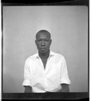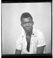 - A man wearing a dress shirt sitting facing forward in the studio.