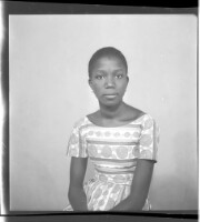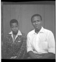 - Two women wearing dresses, headscarves, one wearing a necklace, and both sitting facing forward in the studio.