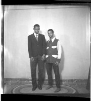 - Two men, one wearing a suit and tie, the other wearing a dress shirt and pants, both standing, one facing forward the other in profile in the studio.