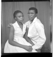 - An old man wearing a boubou next to a woman wearing a dress and headscarf, both sitting facing forward in the studio.
