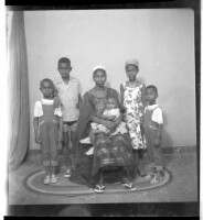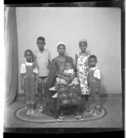 A woman wearing a dress, headscarf, and necklace, holding a little girl on her lap sitting facing forward between three boys, one wearing a shirt and shorts and the other two wearing a t-shirt and overalls, a little girl standing with them wearing a dress