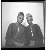 Tow men wearing boubous and sunglasses sitting in profile in the studio.