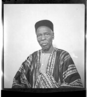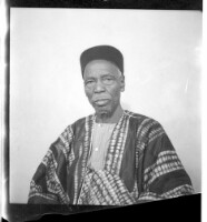 An old man sitting wearing a boubou and hat in profile in the studio.