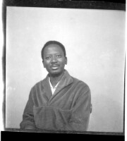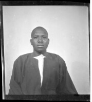 A man wearing a boubou sitting facing forward in the studio.