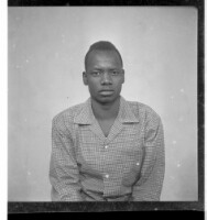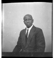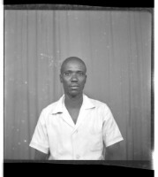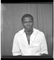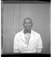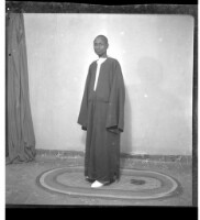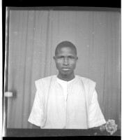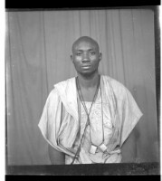 - A man wearing a boubou and amulets around his neck sitting facing forward in the studio.