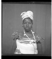 - A woman wearing a dress, headscarf, and necklace sitting facing forward in the studio.