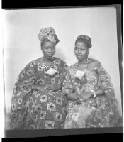 - Two women wearing dresses and headscarves and necklaces sitting in profile in the studio.