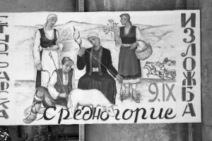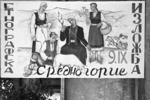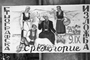 Poster for ethnographic exhibition, town of Srednogorie; 1946-1952; taken by an unknown photographer; 1946-1952, black-and-white negative, dirty, scratchy, good quality; 24x36 mm; Inventory in Bulgarian language