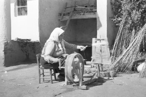 Working with a spinning-wheel; village of Vasilovtzi, district of Lom; 1946-1952; taken by N. Nikolov; black-and-white negative with good quality, dirty; 24x36 mm; Inventory in Bulgarian language