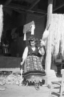 Female cosstume and spinning with a distaff; village of Stara Mahala, district of Lom; 1946-1952; taken by N. Nikolov; black-and-white negative with good quality, dirty; 24x36 mm; Inventory in Bulgarian language