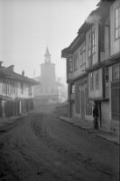 Clock-tower and a street leading to it; town of Tryavna; 1946-1952; taken by G. Danchev; black-and-white negative with good quality, dirty; 24x36 mm; Inventory in Bulgarian language