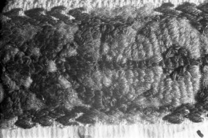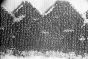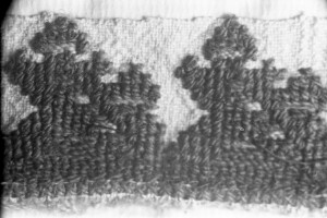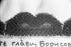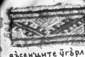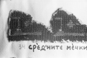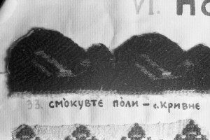 Embroidery from the collection of NEM, photographed for prof.Ivan Koev, with inscription; town of Sofia; 1946-1952; taken by N. Nikolov; black-and-white negative with good quality, dirty; 24x36 mm; Inventory in Bulgarian language
