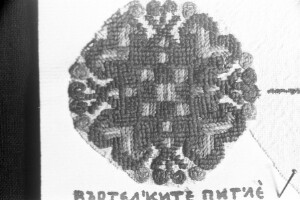 Embroidery from the collection of NEM, photographed for prof.Ivan Koev, долу надпис - "Въртелките питле"; town of Sofia; 1946-1952; taken by N. Nikolov; black-and-white negative with good quality, dirty; 24x36 mm; Inventory in Bulgarian language