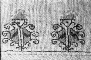 Embroidery from the collection of NEM, photographed for prof.Ivan Koev; town of Sofia; 1946-1952; taken by N. Nikolov; black-and-white negative with good quality, dirty, scratchy; 24x36 mm; Inventory in Bulgarian language