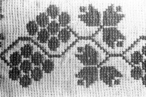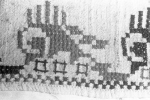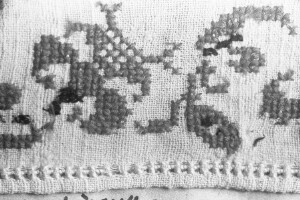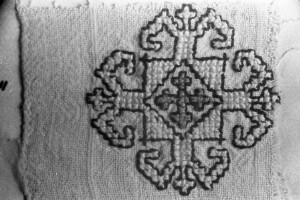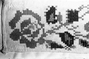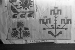 Embroidery from the collection of NEM, photographed for prof.Ivan Koev, под фигурата надпис - "клонита"; town of Sofia; 1946-1952; taken by N. Nikolov; black-and-white negative with good quality, dirty; 24x36 mm; Inventory in Bulgarian language