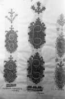 Embroidery from the collection of NEM, photographed for prof.Ivan Koev, надпис под първа фигура - "гулемите търкулета/ с. Кривне", под втората фигура - "чернооките/ с. Кривне", под третата фигура - "с. Кривне"; town of Sofia; 1946-1952; taken by N. Nikolov; black-and-white negative with good qual...