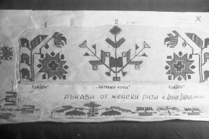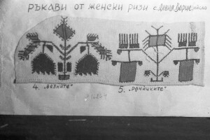 Embroidery from the collection of NEM, photographed for prof.Ivan Koev, над шевиците надпис - "ръкави от женски ризи - с. Девня, Варненско", под шевиците от ляво на дясно - "везните" и "ръчичките"; town of Sofia; 1946-1952; taken by N. Nikolov; black-and-white negative with good quality, dirty; 2...