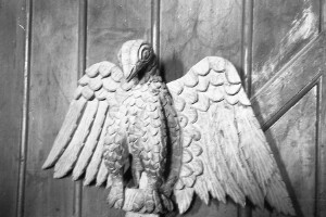Wood-carving, detail of a figure of an eagle - from the collection of NEM; town of Sofia; 1948-1952; taken by N. Nikolov; Black-and-white negative with good quality, dirty; 24x36 mm; Inventory in Bulgarian Детайл от резба, фигура на орел