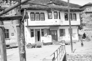House with inscription over the entrance - unknown area; 1948-1952; taken by V. Marinov; Black-and-white negative with good quality, dirty; 24x36 mm; Inventory in Bulgarian language