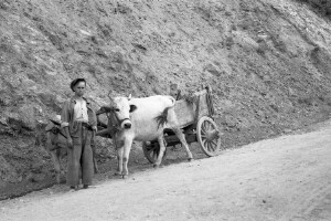 Two-wheeled oxcart - unknown area; 1948-1952; taken by V. Marinov; Black-and-white negative with good quality, dirty; 24x36 mm; Inventory in Bulgarian language
