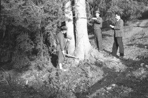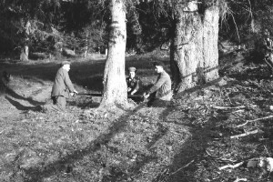 Lumbermen and wood-cutting - unknown area; 1948-1952; taken by V. Marinov; Black-and-white negative with good quality, dirty; 24x36 mm; Inventory in Bulgarian language