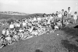 Schoolchildren on a village square - unknown area; 1948-1952; taken by V. Marinov; Black-and-white negative with good quality, dirty; 24x36 mm; Inventory in Bulgarian language