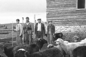 Shepherds with a flock - unknown area; 1948-1952; taken by V. Marinov; Black-and-white negative with good quality, dirty; 24x36 mm; Inventory in Bulgarian language
