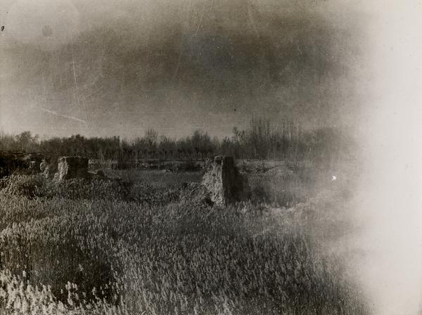 Genre: Landscape Photography General view. The figure in the foreground is certainly not Stein. Subjects = archaeological expeditions; archaeological sites; Stein Collection Location = China; Xinjiang; Yotkan