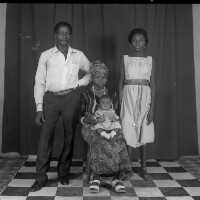 206. EAP054/1/170/536 Reference (shelfmark): EAP054/1/170/536 Title: Recreational photograph [c 1985] Scope & Content: Woman sitting holding baby, man standing and woman standing either side Format of original: 59mm x 59mm plastic negative Collection Area: Endangered Archives Programme Languages: Not applicable Date Range: c 1985 Extent: 1 TIFF image