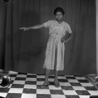 57. EAP054/1/170/415 Reference (shelfmark): EAP054/1/170/415 Title: Recreational photograph [c 1985] Scope & Content: Young woman standing, extended right arm, pointing Format of original: 59mm x 59mm plastic negative Collection Area: Endangered Archives Programme Languages: Not applicable Date Range: c 1985 Extent: 1 TIFF image