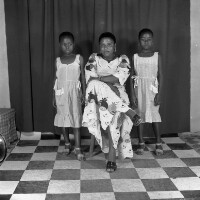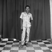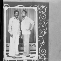Man standing, in dark trousers with white stripes and a short-sleeved shirt, between 2 tied back curtains. Format of original: 59mm x 59mm plastic negative