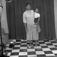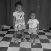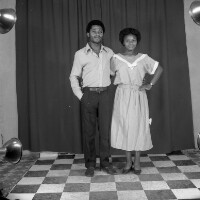 Man and woman standing: womans right arm around his waist and left hand on hip; mans right hand in pocket of his trousers and left arm around her waist. Format of original: 59mm x 59mm plastic negative
