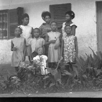 9 people: 3 young women at back, 2 little boys and 4 girls standing, in front of a house with a small garden, plants in front. Format of original: 59mm x 59mm plastic negative