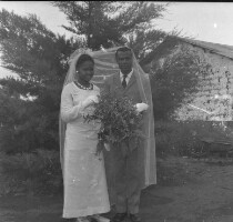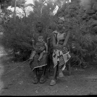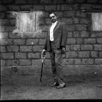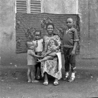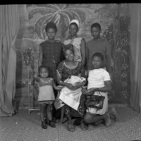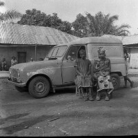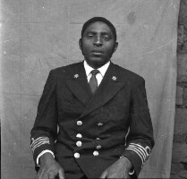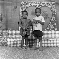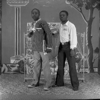 2 young men, one in "boubou" shirt and the other in white shirt, each with right arm on iron grillwork behind. Format of original: 59mm x 59mm plastic negative