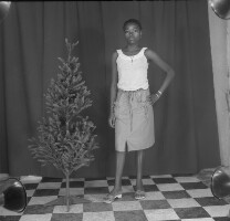 128. EAP054/1/170/235 Reference (shelfmark): EAP054/1/170/235 Title: Recreational photograph [c 1985] Scope & Content: Girl standing by a plastic tree Format of original: 57mm x 59mm plastic negative Collection Area: Endangered Archives Programme Languages: Not applicable Date Range: c 1985 Extent: 1 TIFF image