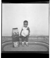 128. EAP449/2/14/254 Reference (shelfmark): EAP449/2/14/254 Title: A baby wearing overalls standing face-forward next to a box in the studio. Collection Area: Endangered Archives Programme Languages: Not applicable Date Range: 2nd half od the 20th century Extent: 1 TIFF image