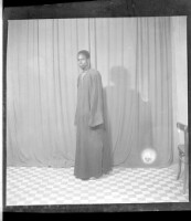 124. EAP449/2/14/554 Reference (shelfmark): EAP449/2/14/554 Title: A man wearing a black boubou standing in profile in the studio. Collection Area: Endangered Archives Programme Languages: Not applicable Date Range: 2nd half od the 20th century Extent: 1 TIFF image