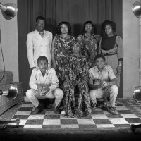 158. EAP054/1/46/124 Reference (shelfmark): EAP054/1/46/124 Title: Recreational photograph [c 1984 - 1985] Scope & Content: Seven people: woman sitting on a stool, 2 people crouching next to her, the others standing behind. Format of original: 59mm x 59mm plastic negative Collection Area: Endangered Archives Programme Languages: Not applicable Date Range: 1984-1985 Extent: 1 TIFF image
