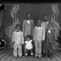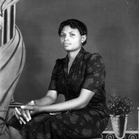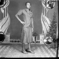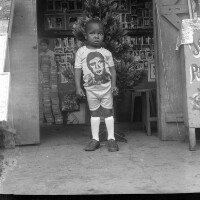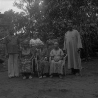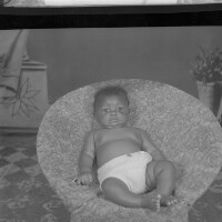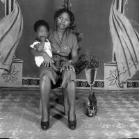 Woman from Babadjou, sitting on a stool, child on her right knee, in dark shoes with her hair plaited. Format of original: 59mm x 59mm plastic negative