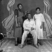 Group of 3 people: Man sitting between two women, with crossed arms, one womans left hand on plastic tree behind the man. Format of original: 59mm x 59mm plastic negative